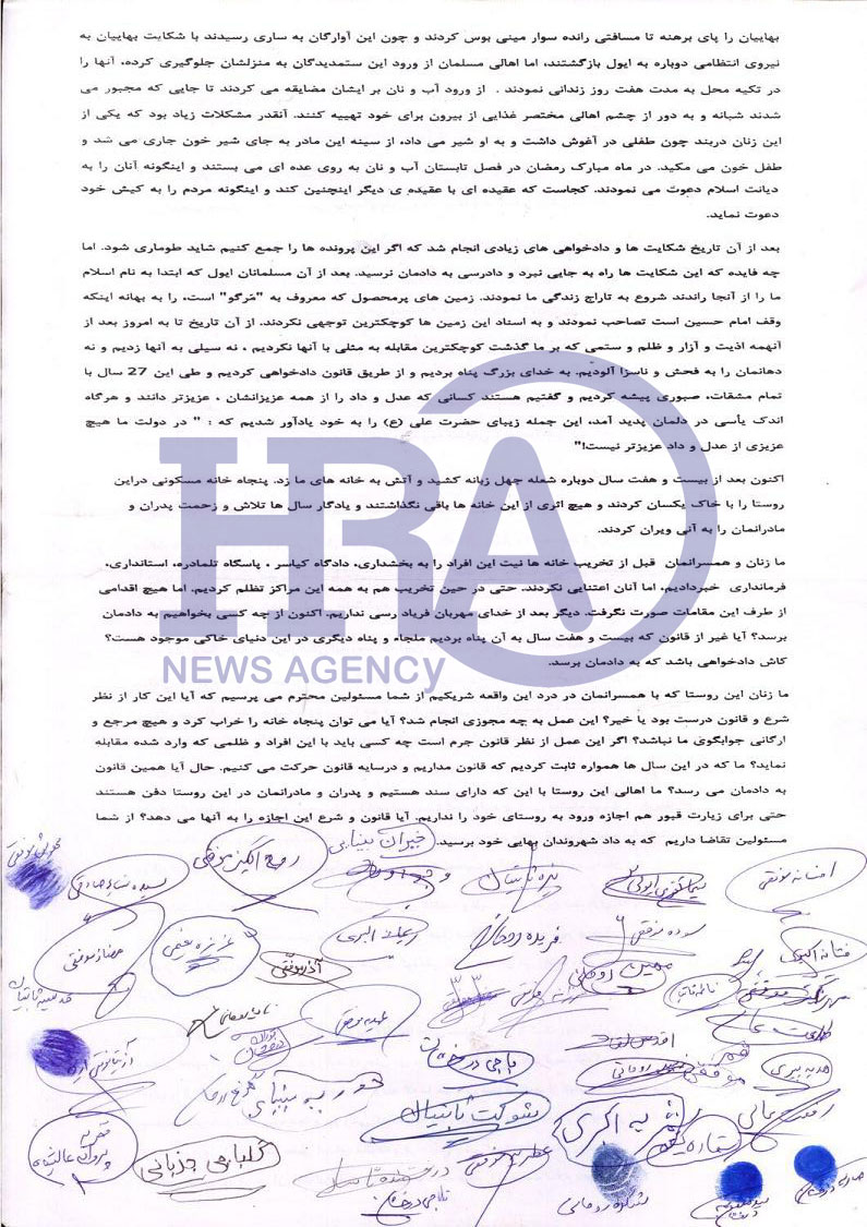 ما زنان این روستا که با همسرانمان در درد این واقعه شریکیم از شما مسئولین محترم می پرسیم که آیا این کار از نظر شرع و قانون درست بود یا خیر؟ این عمل به چه مجوزی انجام شد؟ آیا می توان پنجاه خانه را خراب کرد و هیچ مرجع و ارگانی جوابگوی ما نباشد؟ اگر این عمل از نظر قانون جرم است چه کسی باید با این افراد و ظلمی که وارد شده مقابله نماید؟ ما که در این سال ها همواره ثابت کردیم که قانون مداریم و درسایه قانون حرکت می کنیم. حال آیا همین قانون به دادمان می رسد؟ ما اهالی این روستا با این که دارای سند هستیم و پدران و مادرانمان در این روستا دفن هستند حتی برای زیارت قبور هم اجازه ورود به روستای خود را نداریم. آیا قانون و شرع این اجازه را به آنها می دهد؟ از شما مسئولین تقاضا داریم که به داد شهروندان بهایی خود برسید.